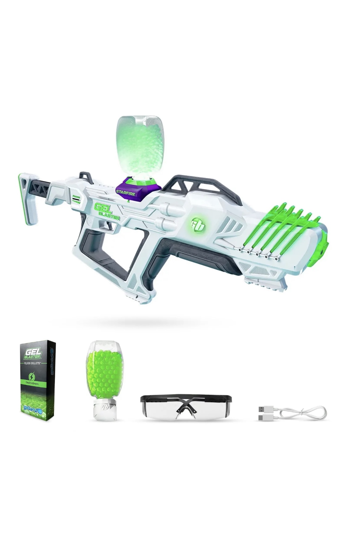 1. Up to (10) players 2. (10) Guns 3. (10) Goggles 4. (10) Masks 5. (4) Bunkers 6. (4) Barrels 7. Gel Depot Containers 8. Includes (35,000) Gellyballs 9. Includes (3,000) Gellyballs per player 10. Refills (1,000) Gellyballs — $10 per 11. Extra players are $25 per 12. Safety Referee